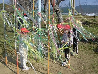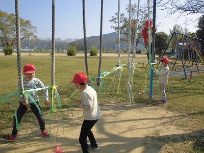 11月9日(水)2・3校時、1年生が図工「ひらひらゆれて」に取り組んでいました。1組は運動場、2組はフラワーランドの遊具に色とりどりのテープを工夫しながら結びつけて飾り付けをし、中に入ったり登ったりしながらその出来映えを楽しんでいました。いいお天気で、風に吹かれるテープが日射しに映えてとてもきれいでした。