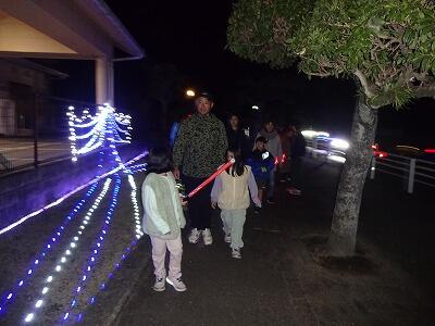 12月8日(金)PTA生活指導部主催の夜間歩行(歩こう会)が行われました。今年も150名を超える親子が参加してくれました。19:00に学校をスタート。最初は真っ暗な田んぼの中のコースですが、参加賞として子どもたちが腕に付けた「光るブレスレット」のいろいろな明かりの色がきれいに見えました。川の堤防を通り、クリスマスイルミネーションがきれいな通りを歩いてゴールです。今年も出題された「校長先生は何歩でゴールするでしょう?」というクイズ、今回は9368歩でした。参加してくださった保護者の皆さんと子どもたち、そしてPTA役員の皆様、お疲れ様でした。