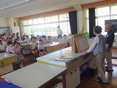 6月7日(水)1・2校時、4年生は総合的な学習の時間で地域の伝統芸能「櫂伝馬踊り」について学習しました。今日は「櫂伝馬踊り保存会」の方3名をお招きして、初めに「櫂伝馬踊り」の歴史について紙芝居を見ながら学びました。途中で、自分たちが練習している口上が出てくると互いに顔を合わせてうなずいていました。毎年4年生はこのような形で「櫂伝馬踊り」について学び、その後、自分たちが実際に踊りをマスターすることで継承活動をつないでいます。保存会の皆様、今後ともご指導よろしくお願いいたします。