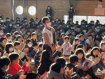 12月4日(月)朝の時間に体育館で全校朝会を行いました。まず校長から世界のいろいろな国で一生懸命にがんばっている子どもたちのことについて話をしました。その後、担当の先生から12月の生活目標「あたたかい言葉をつかおう」についての話がありました。本校では人権週間に「サンキューカード」の取組を展開する予定です。最後にスポーツの大会で活躍した子どもたちにみんなで拍手を送りました。朝の寒い時間帯でしたが、子どもたちはしっかりとした態度で話を聞いていました。