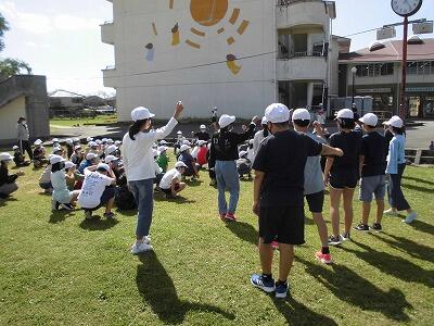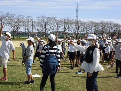 10月11日(火)3連休明け、秋の涼しい風が吹いています。昼休み時間、今日は白団が運動場の北側2か所に分かれて、リーダーを中心に応援練習をしていました。白団は、今週から本格的に応援パターンを全学年で共有する時間がスタートです。白団も赤団と同じようにリーダー達が積極的に動いていて、それに4年生以下の子どもたちがしっかり応えていました。すばらしいチームワークです。