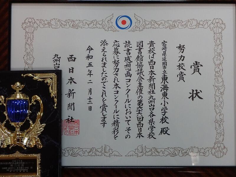 本年度の第66回西日本読書感想画コンクールにおいて、本校が「努力校賞」を受賞しました。西日本新聞社様より賞状と盾が贈られてきましたので、校長室前に掲示しています。お気に入りの本や担任の先生方が読み聞かせをした本について感じたことを、子どもたちが自分らしく表現した図画作品がたくさんあり、そのことを認めていただいたのだと思います。これからもいろんな本と出会いながら、感性を働かせ思いを深めたり表現したりできる子どもたちであってほしいと思います。