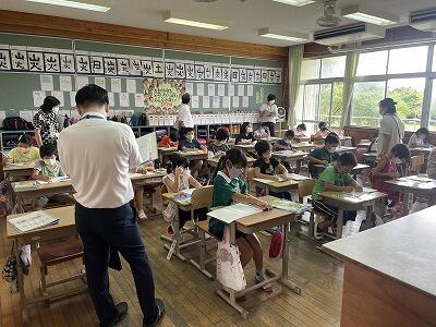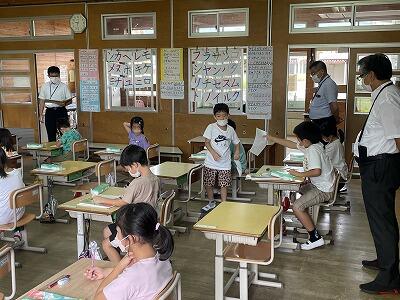 9月12日(月)学校訪問ということで、延岡市教育委員会から5名、北部教育事務所から2名の先生方が来校されました。1校時に学校経営説明・協議を行った後、2~4校時にすべての学級の授業を参観していただきました。「子どもたちが一生懸命に授業に取り組んでいますね」というお言葉をいただきました。午後からは、1・2年、3・4年、5・6年の学年部に分かれ、指導主事の先生方にもお一人ずつ入っていただき、午前中の授業参観をもとに研究協議会を行いました。明日からの授業に生かせるヒントをたくさん見付けることができた時間となりました。
