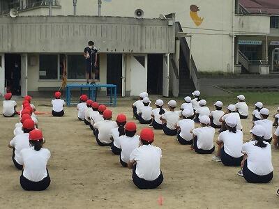 9月22日(木)3校時、運動会全体練習1回目を行いました。先週の雨で1週間延期となり、今日初めて赤団、白団が全員、運動場に集まりました。開会式の練習を中心に、礼の仕方や動きのタイミング、ラジオ体操のポイント等を全体で確認しました。終わりの方になって雨がぱらつきましたが、それぞれの団の5・6年生リーダーがてきぱきと動き、スムーズに練習が進みました。