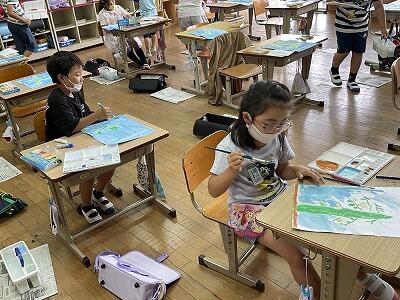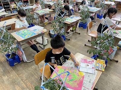 6月13日(月)雨です。11日に県内も梅雨入りしたみたいですね。2、3校時に2年生は図工で、今、育てているミニトマトの絵を描いていました。よく見て、感じたままに画用紙の上にクレヨンや絵の具を使って表現していました。絵に描くと、今までと違ったことが見えてきたりとか新しい発見があったりします。きっと2年生もそんなことを感じながら、描くことを楽しんでいるようでした。