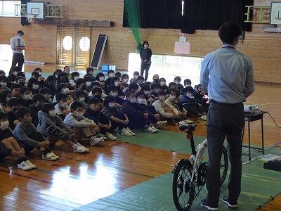 5月1日(月)2校時から4校時にかけて1・2年、3・4年、5・6年の順に交通安全教室を実施しました。本来なら運動場で実施するはずでしたが、土日の雨で地面でぬかるんでいたため体育館での実施となりました。本年度は交通安全協会と梅田学園DS延岡の指導員の方にご指導をいただきました。動画や映像クイズをとおして交通ルールについて学ぶとともに、体育館にシートを敷いて作った交差点の横断歩道を実際に歩きながら渡り方を確認しました。これからも一人一人が交通安全には十分に気をつけてほしいと思います。