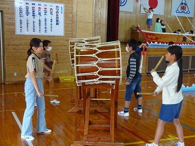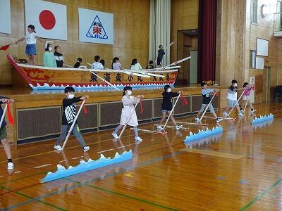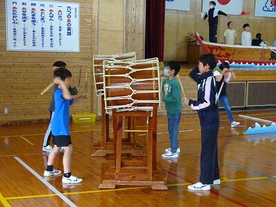 本校では毎年4年生が総合的な学習の時間に、校区内にある大武地区に古くから伝わる「櫂伝馬踊り」の伝承活動に取り組んでいます。5月11日(木)4校時、昨年、地域の方から直接学んだ5年生が4年生の前で「櫂伝馬踊り」を披露してくれました。「この前、1回振り返りをしたぐらいです・・・」と披露前は少し不安そうな5年生でしたが、威勢のよい太鼓の音とかけ声、口上が体育館内に響き渡りました。さすが5年生でした。これから、何時間かを使って5年生が4年生に伝え、その後、地域の方にご指導をいただく計画です。今年も4年生のがんばりに期待したいと思います。