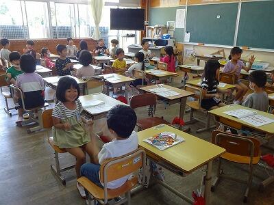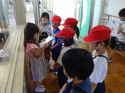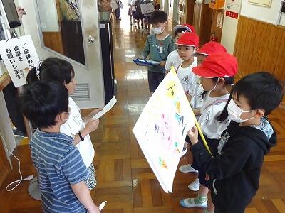 5月24日(水)3・4校時、1・2年生は交流を兼ねて「学校たんけん」をしました。まずは体育館に全員集まって、先生のお話を聞いた後、グループごとに自己紹介です。そのあと1年1組と2年1組のグループは体育館を、1年2組と2年2組のグループは図書室を出発してグループごとにいろいろなと特別教室をめぐりながら、学校にある各部屋の説明を担当の2年生から聞きました。待ち時間はグループの2年生が1年生に絵本の読み聞かせをしていました。2年生はこれまでの練習やリハーサルを生かしてとても上手に案内や説明ができました。1年生も2年生といっしょに学校を回れて楽しそうでした。