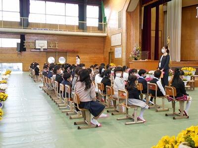 引き続き、始業式です。5、6年生の代表児童が新学年での目標や楽しみにしていることについて発表してくれました。2人とも自分自身のことをしっかりと見つめてのすばらしい内容でした。その後、校長が「”なりたい自分”になるためには本気で"続けること"」という話をしました。最後に全員で校歌斉唱。マスク越しでしたが、元気な歌声が体育館に響いていました。終了後、最後に残った新2年生が元気いっぱいに「がんばります!」と声を合わせて宣言して体育館をあとにして行きました。