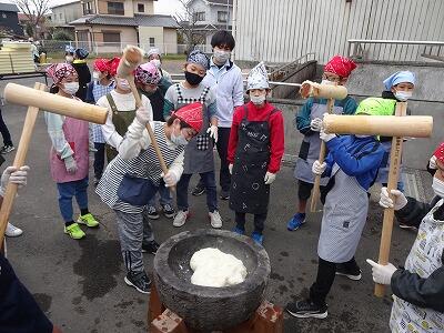 12月16日(金)5年生の「米づくり体験活動」の一環として、収穫したもち米を使って「もちつき」をしました。昨日の午後からうす・きね、その他の道具の準備や洗米・浸水の作業をがんばってきた5年生、今日がいよいよ本番です。子どもたちのために朝早くから保護者の方、おじいちゃん、おばあちゃん方が来校してくださって、薪をくべて釜にお湯わかしたり、うすを温めたりなどの作業をお手伝いしていただきました。ついたり、手水をしたり、返したり、丸めたりなどいろいろな作業を体験して、もちつきの大変さを実感できたのではないかと思います。つきたてのもちをみんなで集まっておいしそうに食べている様子が微笑ましかったです。ご協力いただいた皆様、ありがとうございました。