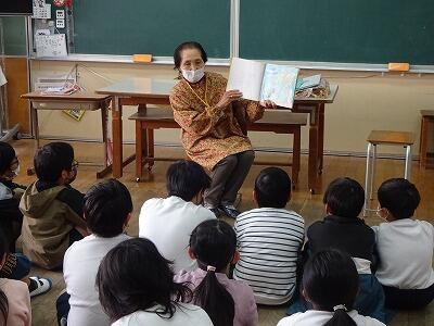 3月9日(木)朝の時間、今週月曜日に引き続き「ティンカーベル」さんによる読み聞かせ会がありました。本日は5名の方が来校され、1・2年生それぞれのクラスに分かれて、選んでいただいた絵本の読み聞かせをしてくださいました。目を輝かせて聞きながら、身を乗り出して絵本の場面をのぞき込んでいる子どもたちもいました。地域の方々のおかげで、子どもたちに温かい心が育っていると思います。