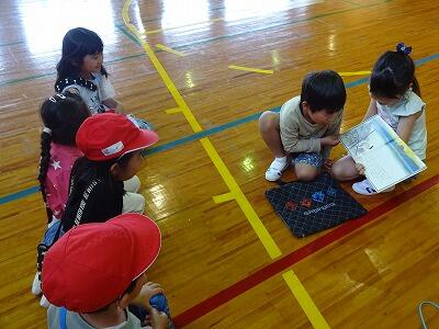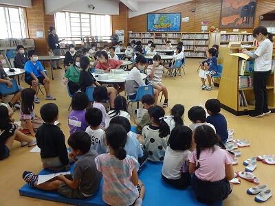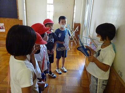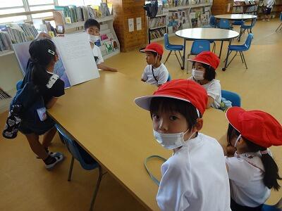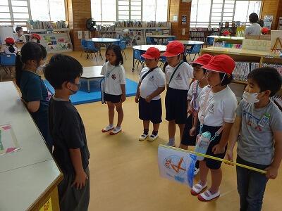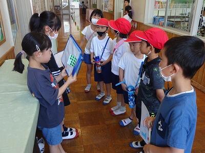 5月24日(水)3・4校時、1・2年生は交流を兼ねて「学校たんけん」をしました。まずは体育館に全員集まって、先生のお話を聞いた後、グループごとに自己紹介です。そのあと1年1組と2年1組のグループは体育館を、1年2組と2年2組のグループは図書室を出発してグループごとにいろいろなと特別教室をめぐりながら、学校にある各部屋の説明を担当の2年生から聞きました。待ち時間はグループの2年生が1年生に絵本の読み聞かせをしていました。2年生はこれまでの練習やリハーサルを生かしてとても上手に案内や説明ができました。1年生も2年生といっしょに学校を回れて楽しそうでした。