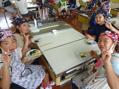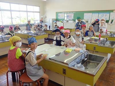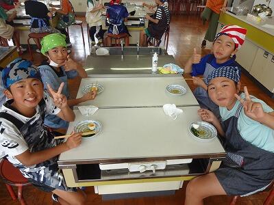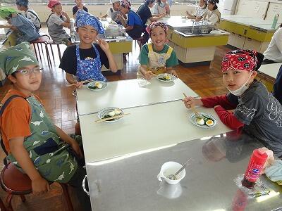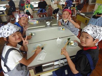 5月26日(金)1・2校時、24日に引き続き、今日は5年2組が調理実習挑戦です。5年生は音楽と家庭科で学級担任の交換授業をしているので、2組も1組担任の先生の指導で調理に取り組みました。男子グループが作ってくれたものを試食しましたが、上手くできていておいしかったです。