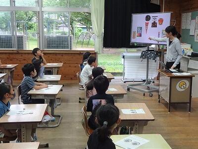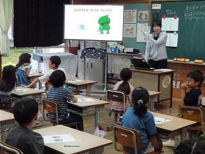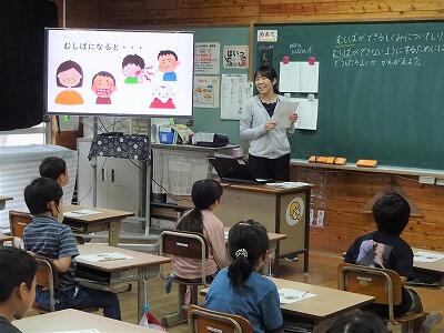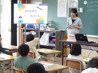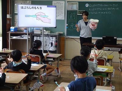 5月31日(水)2校時と5校時に、2年生では6月の「歯と口の健康週間」に合わせて、「むしばのよぼう」についての授業を行いました。今回は保健室の先生が授業に入って、むし歯ができてしまう仕組みや生活の中で気をつけること、歯みがきの仕方等をわかりやすく伝えました。子どもたちも元気よく反応しながら、一生懸命に聞いていました。