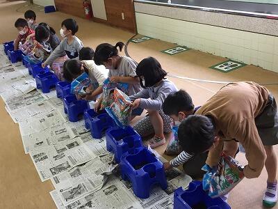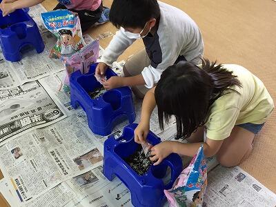 5月12日(木)今日も朝から雨がずっと降っています。3校時、1年生は生活科の時間にアサガオの種まきをしました。あいにくの雨なので、教室横のオープンスペースと生活科室に新聞紙を広げて、1組・2組いっしょに活動しました。土を入れて、肥料を入れて、指で土に穴を開けて、種を入れて・・・・。先生の説明を聞きながら、みんな上手に作業を進めていました。芽が出てくるのを楽しみに待ちたいと思います。
