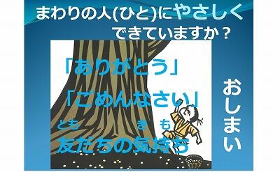 5月2日(月)大型連休の合間の授業日です。朝の時間は全校朝会を行いました。今回もGoogle meetを使ってのリモート朝会です。はじめに校長から、学校のキャッチフレーズである「花いっぱい ゆめいっぱい やさしさいっぱい」の特に「やさしさいっぱい」についてスライドを使いながら話をしました。その後、担当の先生から5月の生活目標である「しっかり話を聞こう」について、大切な3つのポイント「目・耳・心」のお話がありました。明日からまた3連休ですが、5月スタートの今日の1日、やさしい気持ちをもって話をしっかり聞きながら元気に過ごしてほしいと思います。