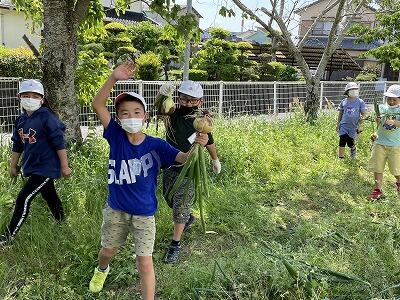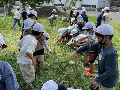 5月2日(月)5校時、3年生が2年生の頃に生活科で育てた玉ねぎの収穫作業をしました。以前このHPでも紹介しましたが、強い風のために一度苗を植え直しをした玉ねぎです。寒い冬を乗り越えて立派に成長し、とっても大きくなりました。大きな玉ねぎを畑から引き抜いて、子どもたちもうれしそうです。お味の方もきっと間違いないと思います!