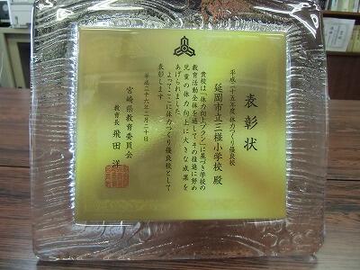 昨日20日は、体育主任と校長で「平成25年度体力つくり優良校」の表彰のため、県庁に行きました。宮崎県の教育長からガラス製の立派な表彰状を受け取りました。