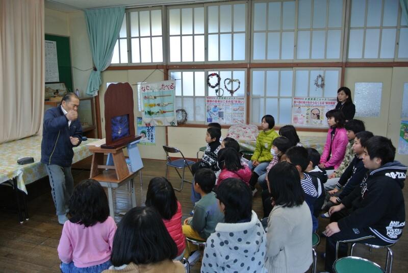 福岡県大川市から、自家用車で何時間もかけて来てくださり、三椪小学校に元気の素を届けてくださる福の神です。今年も新年早々1月15日の朝、三椪小に来校してくださいました。紙芝居で「かさこじぞう」「くもの糸」を読んでくださったり、味わいのある音色でハーモニカ演奏をしてくださったりしました。また、戦時中の生活の苦しさや貧しさ、それを乗り越えて、現在、人が喜ぶ顔を見たくて人のために生きていることなどをお話してくださいました。新年の大きな子ども達への贈り物でした。