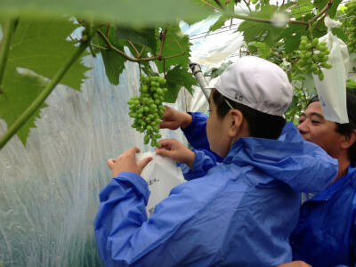今日、ブドウの袋かけがありました。今日は、あいにくの雨でしたが、みんなで楽しく袋かけができました。こうした体験は、あまりできないので、感謝したいです。