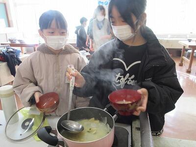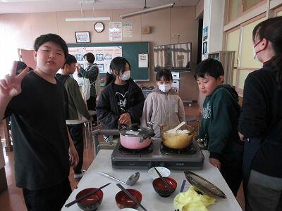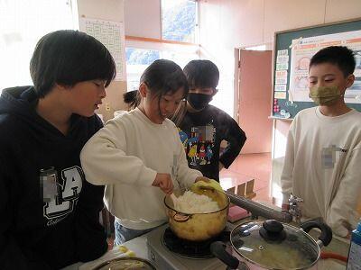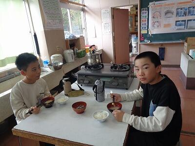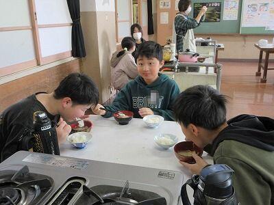 お米は、自分たちで田植え・稲刈りをしたものを使いました。みそ汁の具はダイコンと油揚げです。煮干しでだしを取りました。力を合わせ手際よく作業を進めて、おいしい料理ができあがりました。「今度自分でも作ります」という子がいて頼もしかったです。