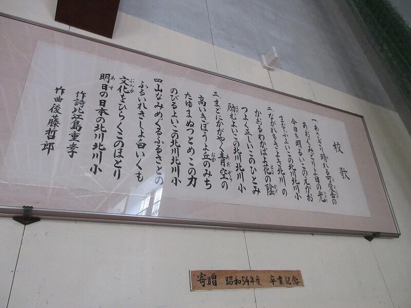 北川小の校歌は、昭和34年かから66年間歌い継がれていることになります。歌詞が4番まであるのは珍しいのではないかと思います。写真は、体育館に掲示してある校歌です。この掲示は昭和54年度の卒業生が送ったものだそうで、偶然ですが私(校長)と同学年の皆さんの卒業記念品のようです。縁を感じました。