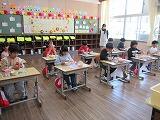 今日16日から1年生の給食開始です。6年生が給食当番をしてくれる間、1年生はとっても静かに待っていました。メニューは、「黒糖パン、鶏肉と野菜のカレークリーム煮、フルーツポンチ」です。先生が「もう少し食べられる人、いるかな。」というと、「はーい」と手を挙げて並ぶ1年生が数名いました。頼もしい。たくさん食べて、元気もりもり!