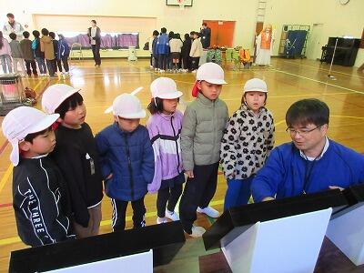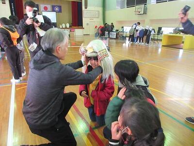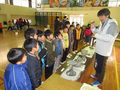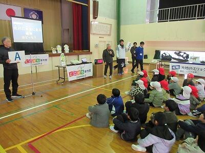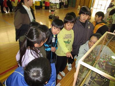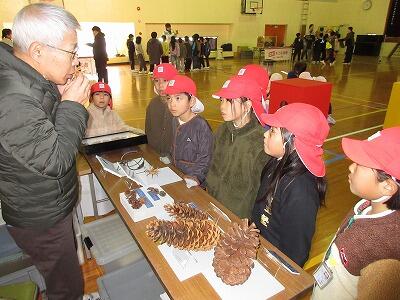 体育館に「地質」「動物」「植物」「歴史」「考古」「民族」のコーナーが作られ、専門の先生が解説してくださいました。子どもたちは初めて見る恐竜の化石や珍しい植物、よろいかぶとや甲冑、土器や石器などに身を乗り出して見入っていました。いきいきした表情が素晴らしかったです。子どもたちの知的好奇心を大いに刺激してもらいました。