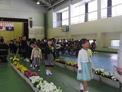 校歌を歌ったあと、校長の話をしました。はじめにくす玉を割ってお祝いをしました。1月の詩「ゆき」の暗唱を何と全校児童104人全員が合格したのです。素晴らしいことです。
