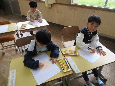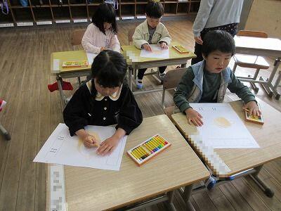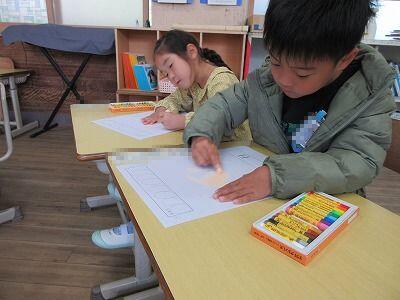 2年生が図工で絵を描いていました(1/14)。クレヨンや絵の具で描いた絵の上に、歯ブラシで絵の具を飛ばしたり型紙の中を絵の具で塗ったり丸めた段ボールで模様をつけたりするなど新たな表現をしていました。自分では思ってもいない描画になる場合もあり、おどろいたり喜んだりしながら楽しく表現していました。完成が楽しみです。