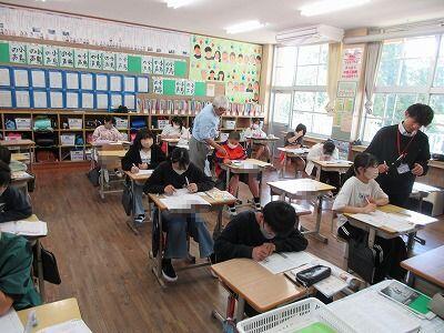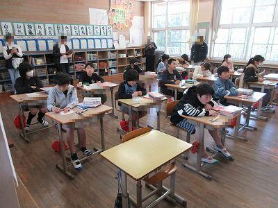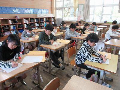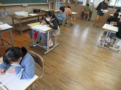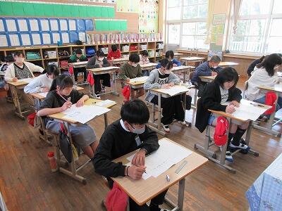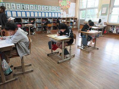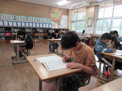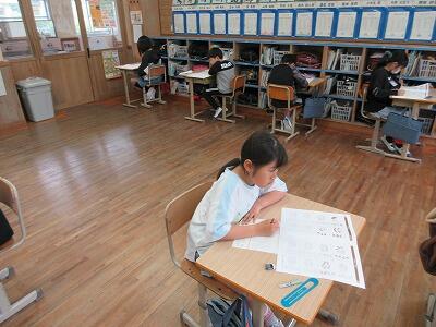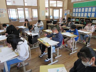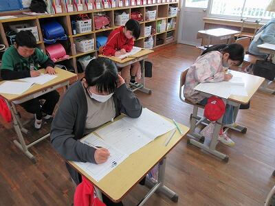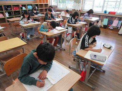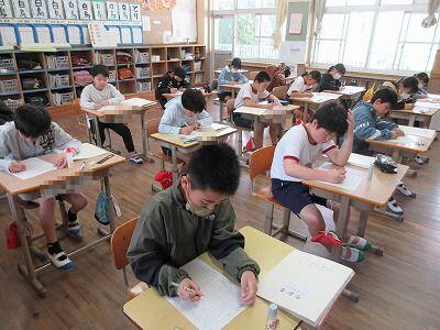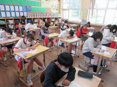 この一年間の学習の成果を確かめる大切なテストです。どの子も真剣に取り組んでいました。いつもの単元テストと違い、問題が冊子になっています。問題量の多さに驚きながらもコツコツと問題を解いていました。