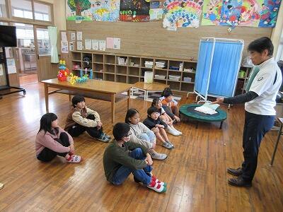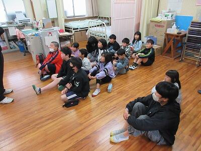 はじめに体育館で全体に話をしていただきました。むし歯になった歯の写真などで歯みがきの大切さを教えていただきました。また、むし歯になった歯は歯医者で治療する必要があることも伝えていただきました。