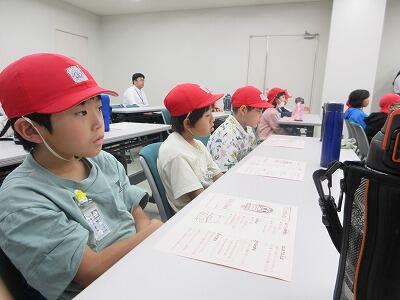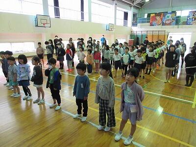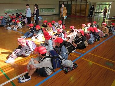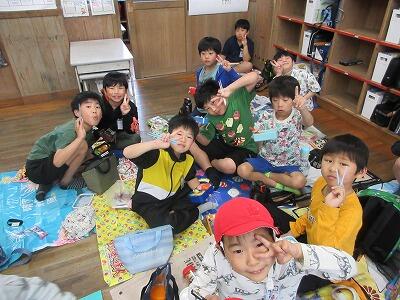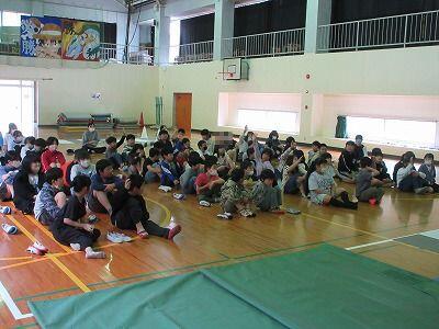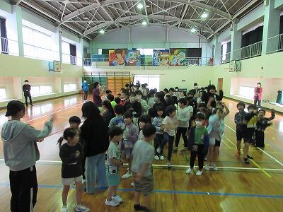 体育館に集合した子どもたちは、みんな元気でニコニコとしていました。今回は、延岡市内の2つの小学校と一緒です。楽しい2日間になることを願っています!