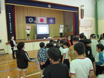 6月2日(月)の午後に全校集会を行いました。今回は、保健給食委員会による「歯」についてのクイズとハンズアップマイスター任命式でした。