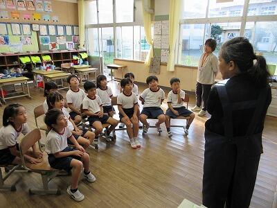 学校に到着した年長さんたちは少し緊張しているようでしたが、すこしずつ笑顔が増えてきました。1年生が用意したおもちゃ(もぐらたたき・どんぐりころころ・わなげ・ボーリングくるま・さかなつり)でとても楽しそうに遊んでくれました。1年生も、少しだけお兄さんお姉さん気分で説明したり手伝ったりしていました。