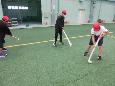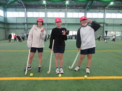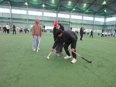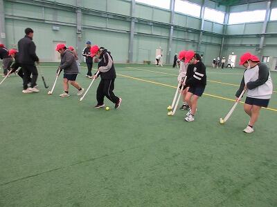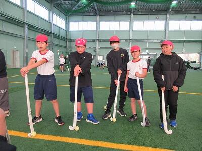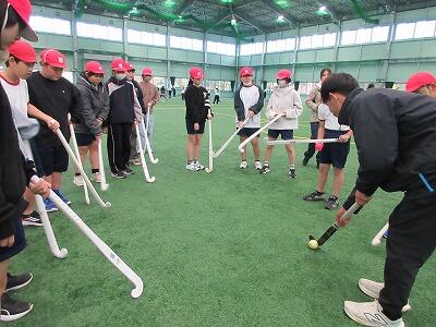 北川小の6年生は、まずホッケーに挑戦しました。国体に出場する選手の皆さんから指導を受け、スティックでボールの扱う練習をさせてもらいました。全員が初めての体験でしたが、ボールをコントロールする面白さを味わうことができました。