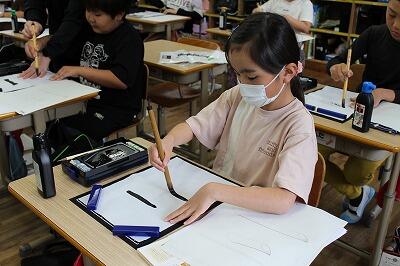 いよいよ筆に墨をつけ、筆を動かす練習をしました。直線や曲線を描いて、筆の感触を味わいました。この日を楽しみにしていた子が多く、いきいきとした表情が印象的でした。