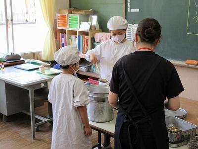 1年生の給食の準備は6年生が行っています。