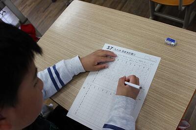 月曜日の朝は全校で百マス計算に取り組んでいます。全校一斉に3分間取り組み、集中力を高めたり脳を活性化させたりしています(1年生はもうしばらくしてから始めます)。