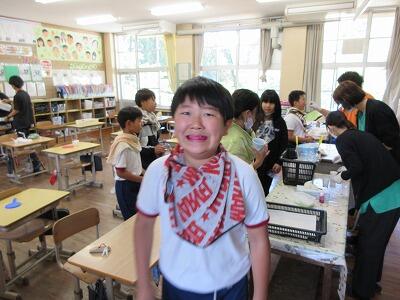 ハンバーガーは、自分でお肉とキャベツをパンにはさんで食べるます。1年生がうまくできるか心配で見に行ったところ、全員がうまくはさんで食べていました。どの子も「おいしい!」と言いながら嬉しそうに食べていました。中には「これを家に持って帰りたい!」という子もいました。よっぽどおいしかったのでしょうね。