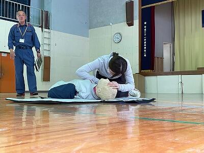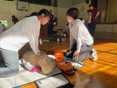 安全確認・意識の確認・119番通報やAEDの依頼・呼吸の確認・胸骨圧迫・人工呼吸という一連の流れを確認・練習しました。また、AEDを取り扱う練習もしました。のどに何かが詰まったときの対処なども教えていただきました。