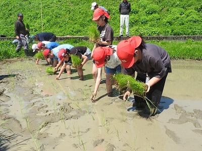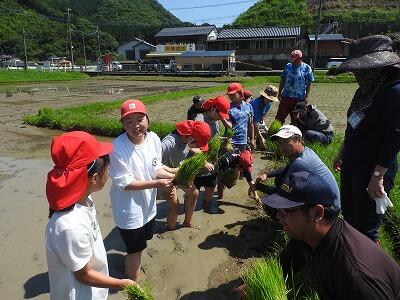 6月19日(水)、川坂地区の田んぼで田植えをしました(梅雨とは思えない晴天でした)。