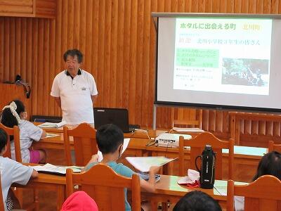 北川やっちみろ会の3名の方に協力をいただき、ホタルについての講話をしていただいたりホタルの幼虫を見せていただいたりしました。ホタルへの興味が大いに高まったようです。