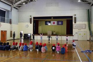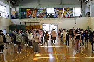 6年生が入場した後に、全校でゲームをしました。〇×ゲームでした。その後に学年ごとの6年生へ向けてのお別れの言葉と出し物でした。1・2年生は、合同で歌やダンスを披露しました。