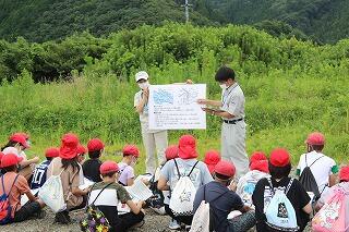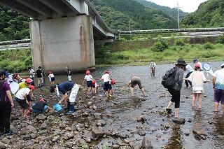 川の中に入って、生き物を見つけその生き物と水のきれいさについて調査しました。グループによって結果が違っているところもありましたが、概ねきれいな川であることがわかったようでした。