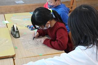 3・4校時、2年生の教室では、生活科で「お正月の遊びをつくろう」という学習をしていました。「ふくわらい」と「たこ」をつくっていました。