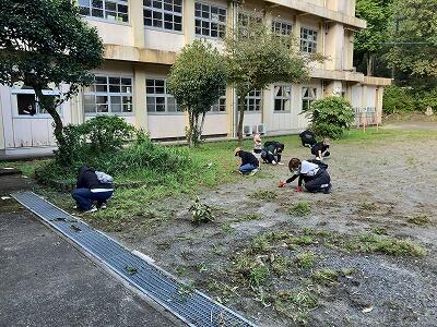 1年生と6年生、2年生と5年生、3年生と4年生がペアとなり運動場の除草作業を行いました。異年齢での交流も目的の一つとしています。