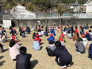 今日の3校時は、火災を想定した避難訓練でした。「事務室で火災が発生しました。」という放送で避難をはじめました。子どもたちは、お・は・し・もの合言葉(おさない・はしらない・じゃべらない・もどらない)をしっかりと守って、運動場に避難することができました。
