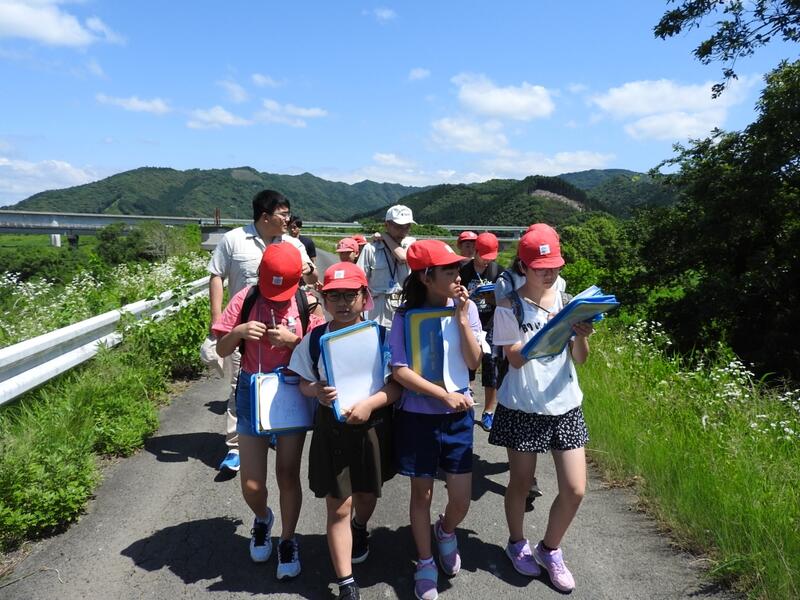 毎年6年生でこの時期に実施している「フィールドワーク」が6月12日、行われました。北川の地域防災についての工夫、北川の歴史、北川の自然について、土木事務所の方々や黒木重代司さんなどの話を聞くことができました。