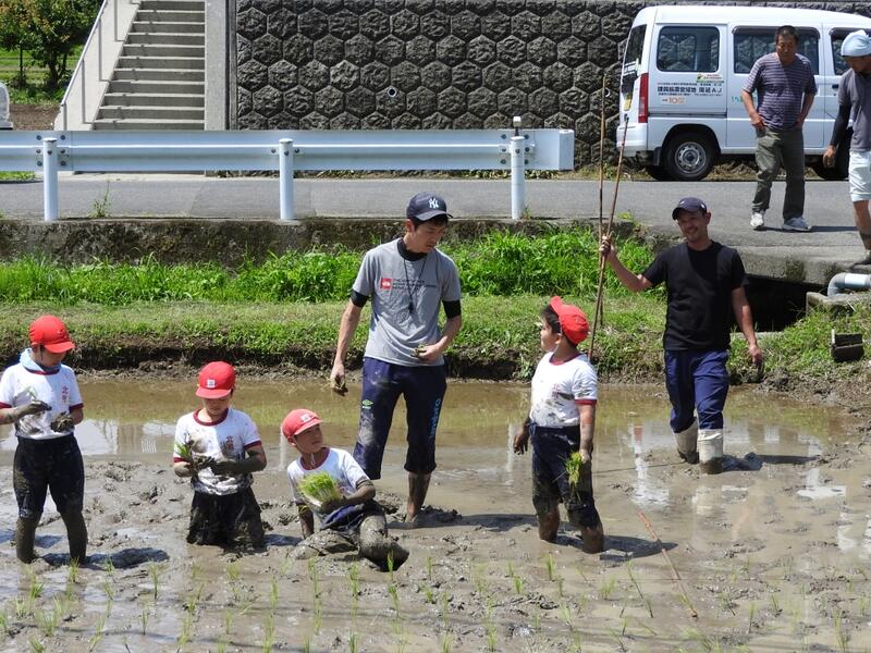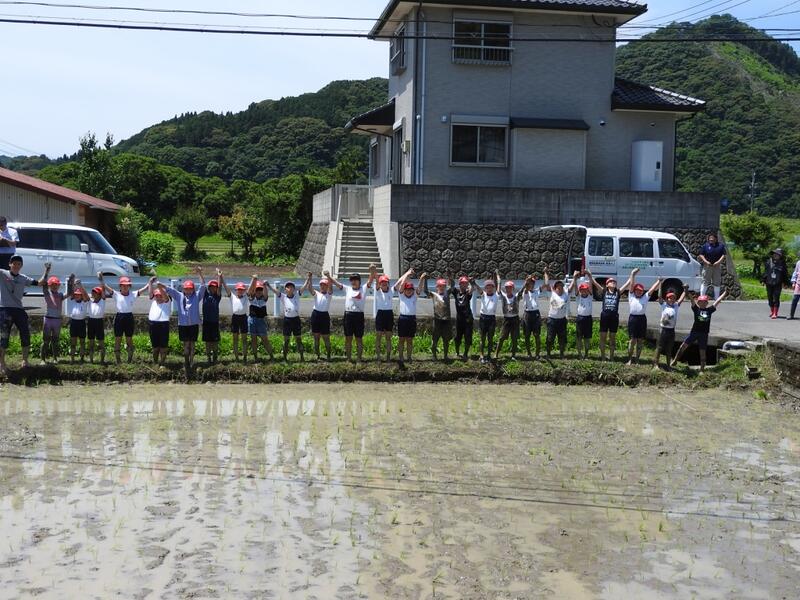6月17日、PTA会長をはじめ、JAの職員の方々にもご協力いただき、5年生が川坂地区で田植えを行いました。 初めはぎこちなく、植えるのに時間がかかっていましたが、コツを掴むと次第にスピードも上がり、2時間ほどで終えることができました。秋の収穫が楽しみですが、途中で稲の生長も見に行く予定にしています。